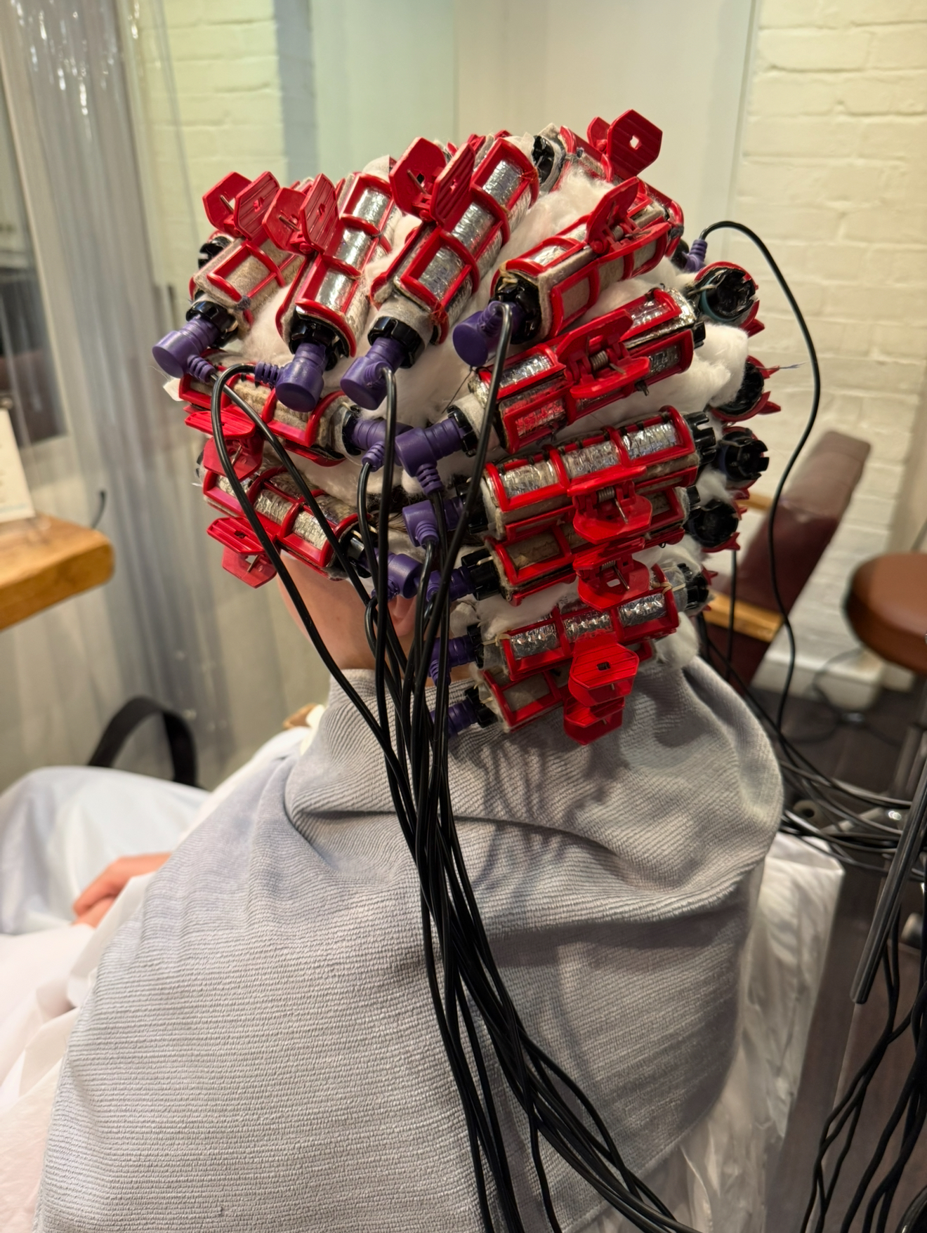 Your hair is wrapped around digital rods connected to the perm machine.